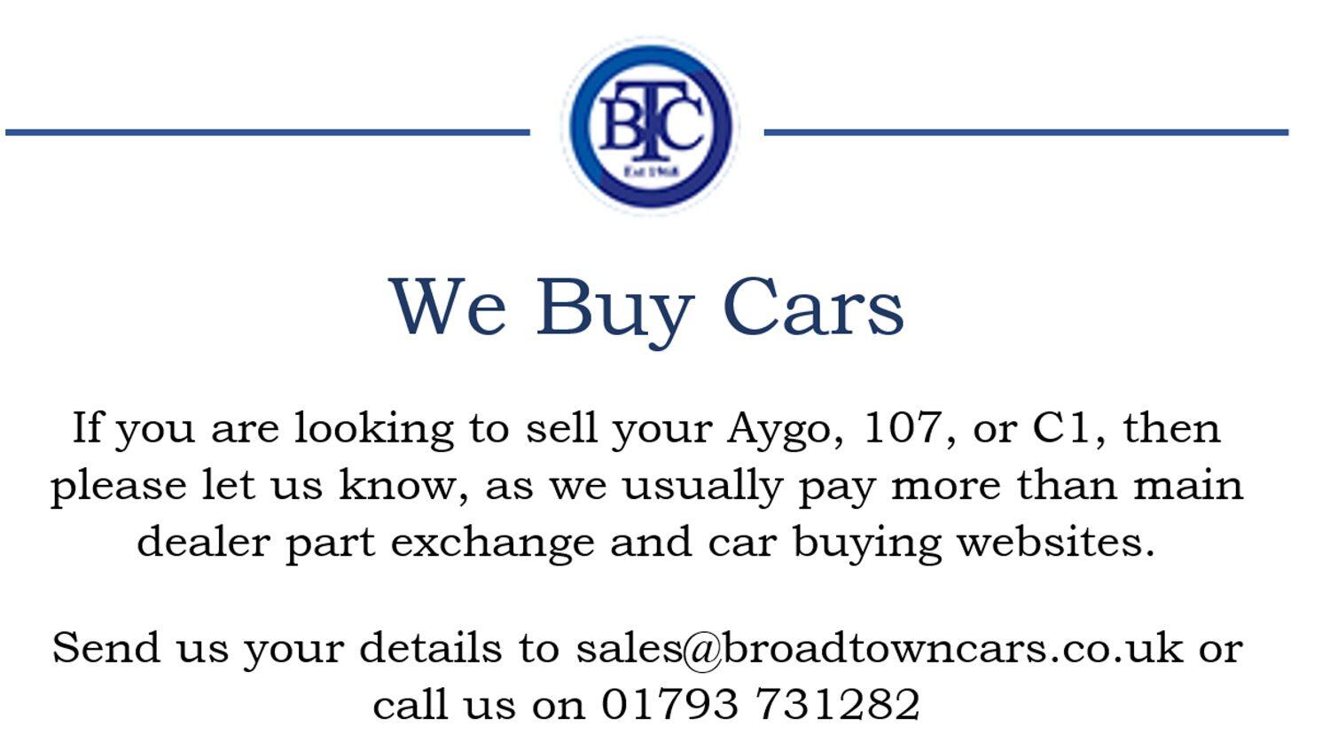 2 KEYS, FULL HISTORY ( 10 STAMPS )SUPER LOW MILES, AIR CON, RADIO CD WITH AUX INPUT, 5 SPEED, ADJ STEERING, ABS, REV COUNTER, REMOTE C/LOCKING, E/WINDOWS, MULTI-AIR BAGS, ISOFIX, CHILD LOCKS, DAY TIME DRIVING LIGHTS -We Have Many More Cars NOT ADVERTISED – Please Click The Link Through To OUR WEB SITE To See ALL OUR STOCK - We Always Have Up To 30 Aygo, 107 & C1 In Stock. With Hundreds Handled We Are Experts In All Aspects Of These Fantastic Small Cars. With One Of The Best Selections In The Area We Feel Well Placed To Offer You Free Expert Advice On All Aspects Of Your New Car. We Are A Family Owned And Run Business Established Since 1968, A Fact We Are Very Proud Of. Find Us Easily 6 miles From J16 Of The M4 ( For Sat Nav Use SN4 7RB) Here At Broad Town We Not Only Sell Cars But Repair Them As Well, Unlike A Lot Of Our Competitors We Are A Proper Garage, We Run Our Own Workshops And MOT Testing On Site. This Means You Have The Peace Of Mind Knowing That It Has Been Inspected By Our Own Technicians. All Cars Come With A Pre Delivery Service And Inspection (PDi) New Or Minimum Of 6 Months MOT, And 3 Month Warranty, Most Major Debit & Credit Cards Are Accepted. Please Use The Link To Click Thorough To Our Web Site broadtowncars.co.uk Here You Can Find Out All About Us, Our Cars And All Those Extra Little Bits That You Really Want To Know ! You Can Also Follow Us On Facebook For Regular Updates Of New Cars Coming In, Just Look For Broad Town Cars